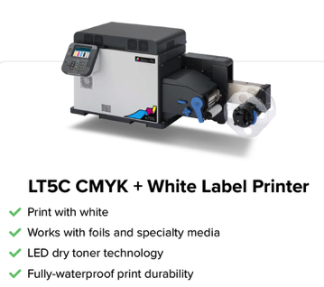 Print White Ink on clear, foil, and dark media. Durable LED toner.